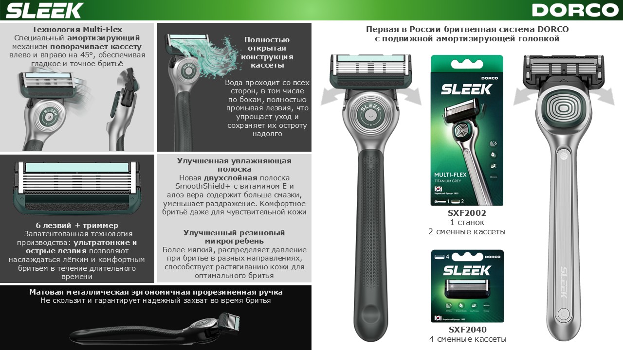 Первая в России бритвенная система DORCO с подвижной амортизирующей головкой.